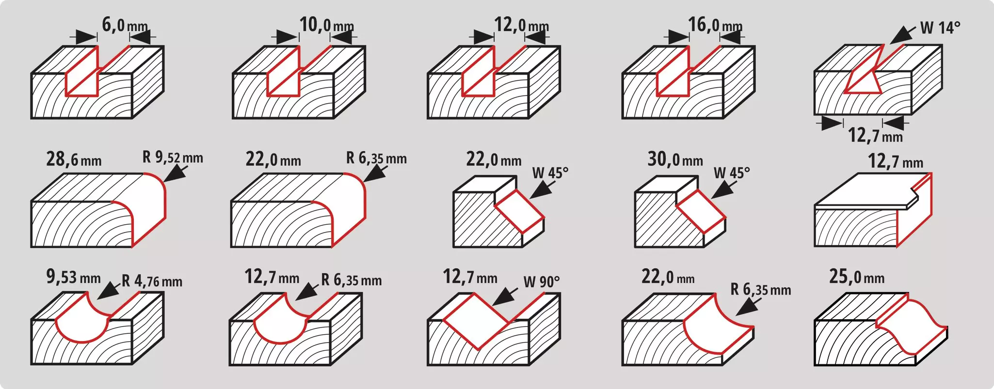 Το σετ περιλαμβάνει τους ακόλουθους φρέζες: 2x φρέζες με αυλακώσεις (O9,5mm, O12,7mm), 1x φρέζες προφίλ (O22mm), 1x φρέζες (O12,7mm), 2x φρέζες (O22 mm, O28,6mm), 2 x 45° φρέζες με λοξότμηση (O22mm, O30mm), 1x φρέζες με αυλάκωση V (O12,7mm), 4 x φρέζες με αυλάκωση (O6, 10, 12, 16mm ), 1x φρέζες ρωμαϊκών όγκων (O25mm) και 1x φρέζες (O12,7mm).